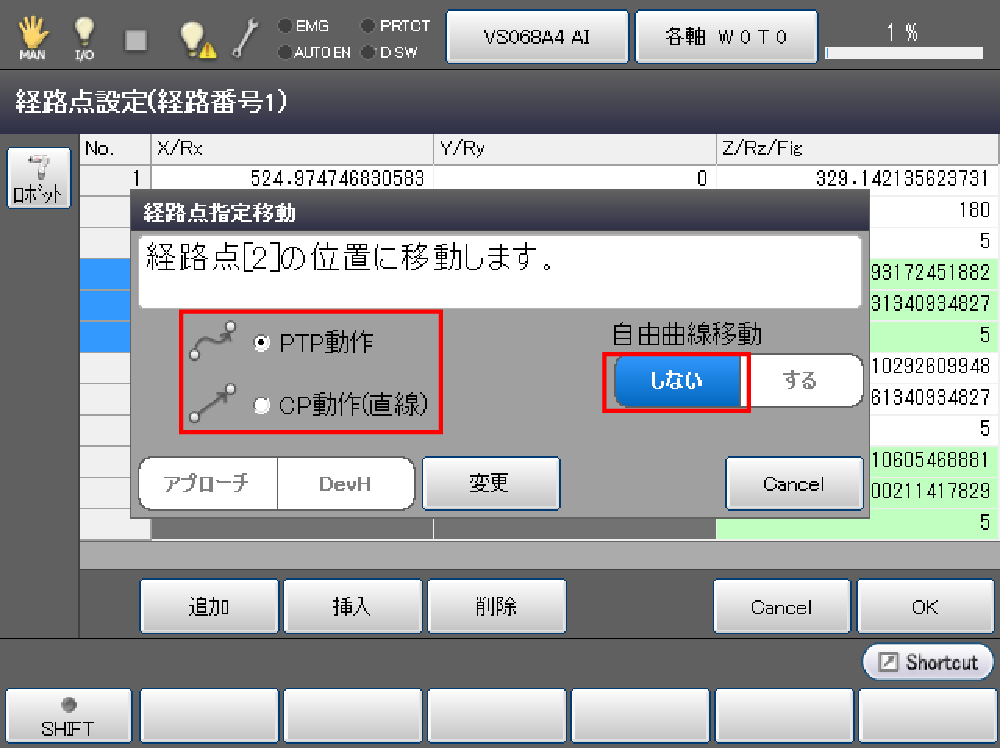 PTP動作かCP動作の指定後、経路点を選択し[移動]ボタンを押します。ペンダントのデッドマンスイッチを押しながら、OKキーを押し続けてください。