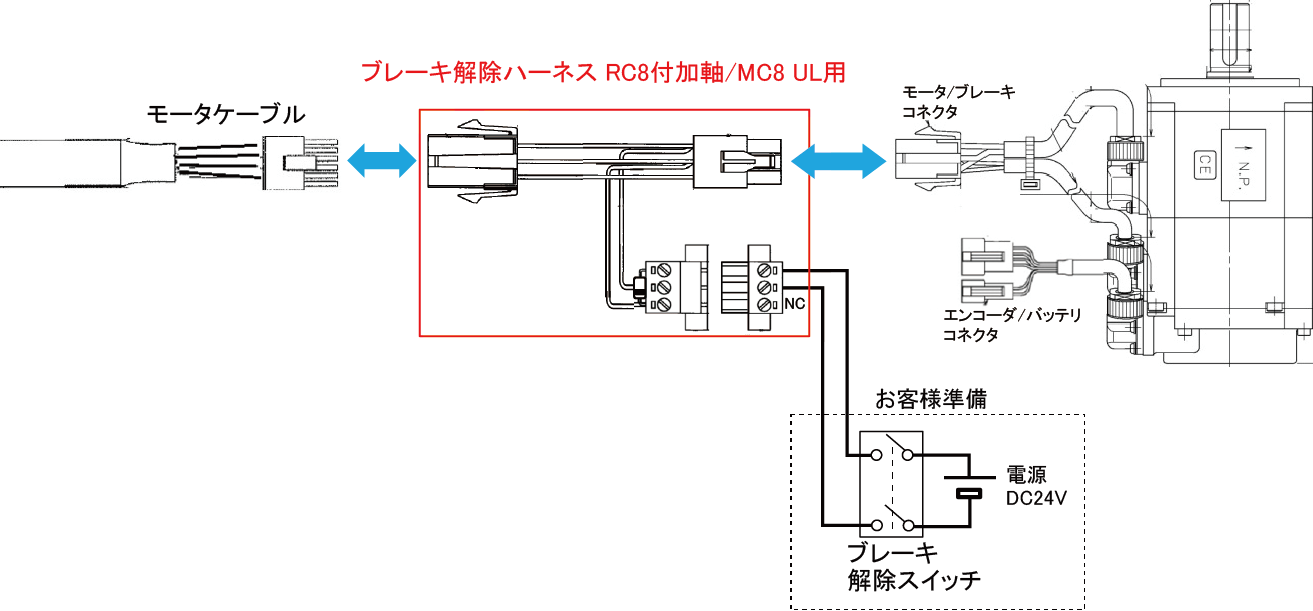 ブレーキ解除ハーネス RC8付加軸/MC8 UL用の接続方法
