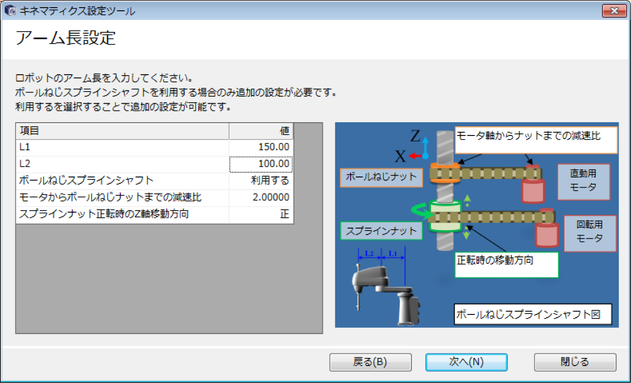 - 「ボールねじスプラインシャフト」を利用する場合のみ、この設定を行ってください。ボールねじスプラインシャフトを利用しない場合に本設定を行うと、ロボットが意図しない動作を行う危険性があります。