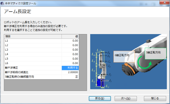 キネマティクス設定ツールで選択したロボットタイプが追加設定可能なタイプの場合、アーム長設定画面で追加設定項目が表示されます。