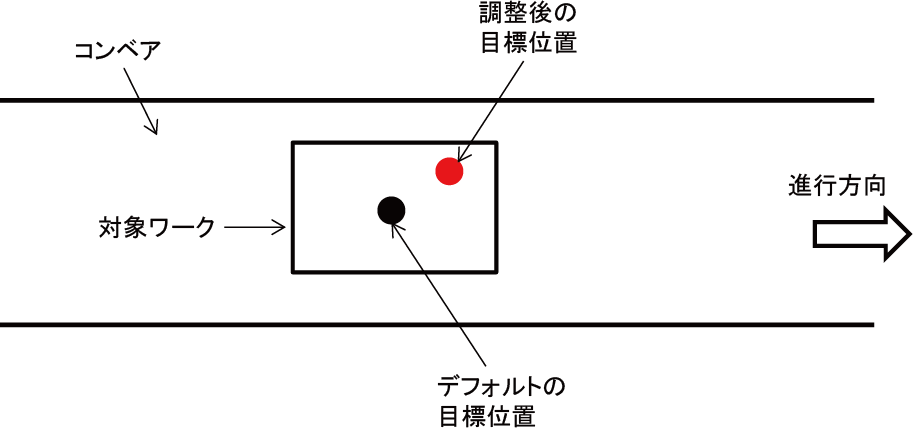この例では、TrackMoveで、デフォルトの目標位置に対し、コンベアベクトル方向に5mm、コンベアの幅方向に10mmオフセットした位置に動作します。