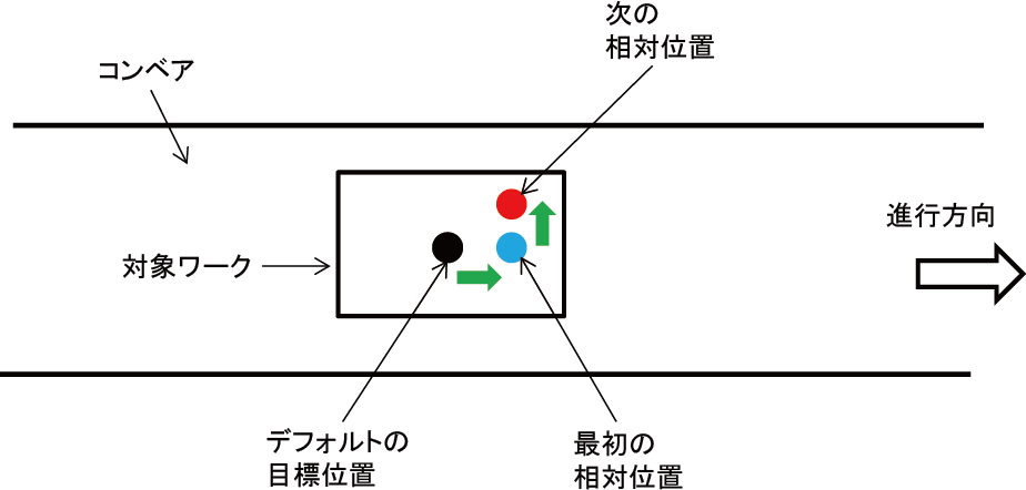 コンベアトラッキング動作中に目標位置を調整したり、相対動作を行う場合は、TrackShiftTargetコマンドやTrackDrawコマンドでオフセット量を指定します。このときのオフセット量は、コンベア座標系で指定します。