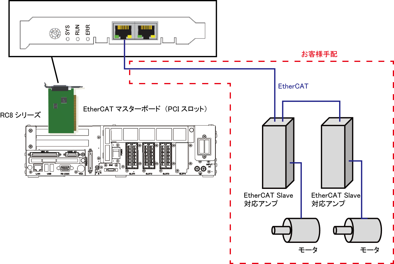 EtherCAT通信を行うためにRC8シリーズコントローラのPCIスロットに、EtherCATマスターボードを増設する必要があります。また機能を有効にするためには「外部付加軸(EtherCAT)」ライセンス(有償)も必要です。