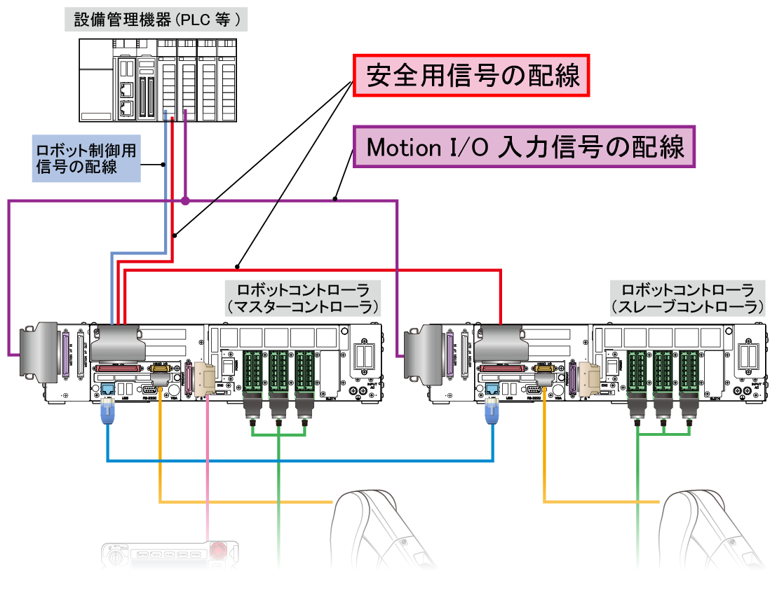 システム全体の中では下図の"安全用信号の配線"と"Motion I/O入力信号の配線"の部分です。