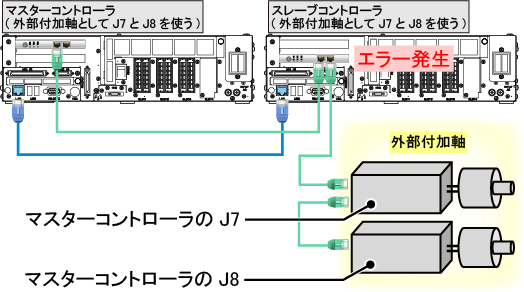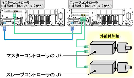 | 例えば、マスターコントローラに外部付加軸としてJ7を、スレーブコントローラにも外部付加軸としてJ7を使用する場合、右の図のようになります。 | ![]() |
