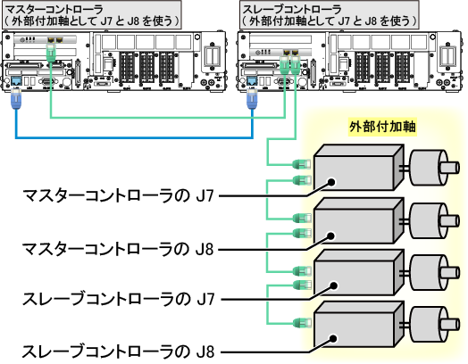 | また、マスターコントローラに外部付加軸としてJ7とJ8を、スレーブコントローラにも外部付加軸としてJ7とJ8を使用する場合、右の図のようになります。 | ![]() |