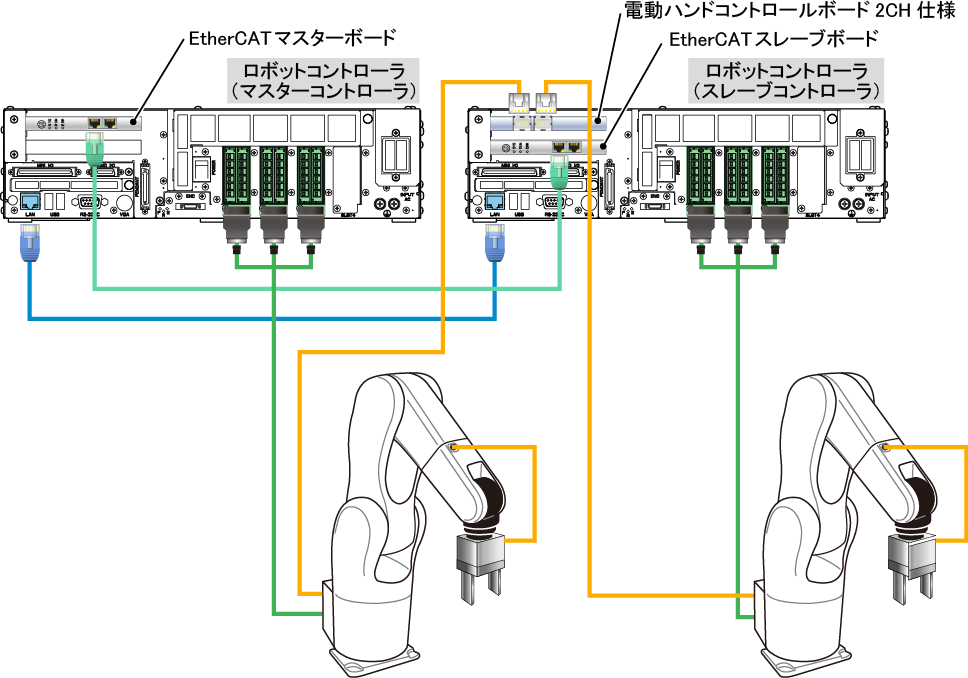 ロボットコントローラどうしの通信方法として、EthernetとEtherCATを併用する場合、マスターコントローラには、電動ハンドコントロールボードを装着できません(EtherCATマスターボードと電動ハンドコントロールボードがともにPCIボードであるため)。