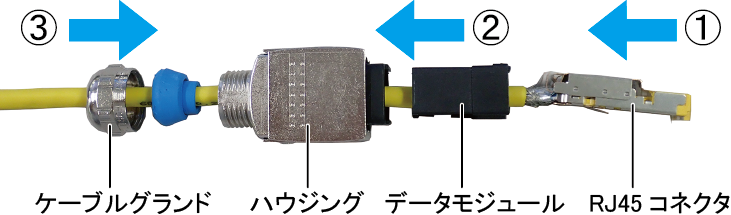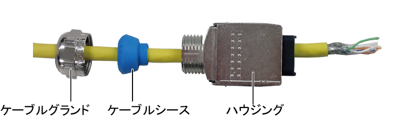 ケーブルグランド、ケーブルシース、ハウジングの順番でケーブルに通します。