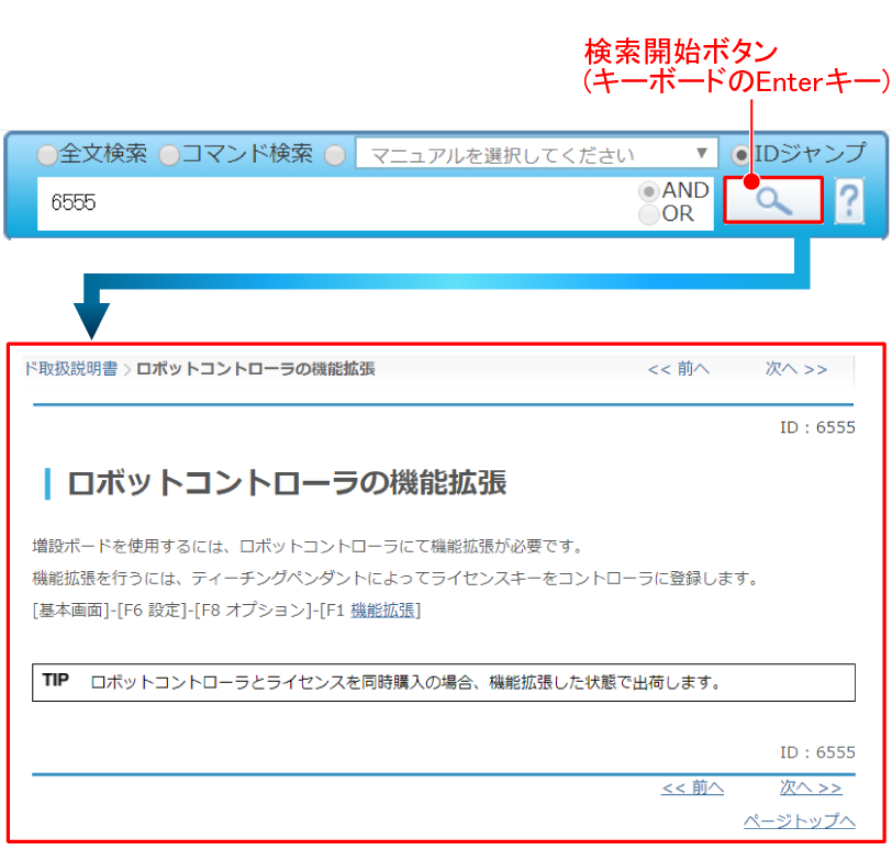 [検索開始ボタン]またはキーボードのEnterキーを押すと、指定したコンテンツID番号のコンテンツへ直接ジャンプします。