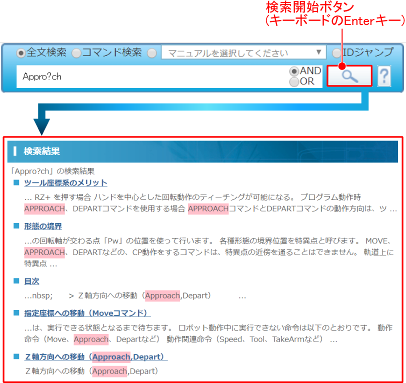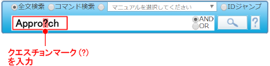 例えば、コマンド"Approach"のスペルの一部を忘れてしまって、"Approach"か"Approoch"か迷ってしまった場合、"Appro?ch"と指定すると、クエスチョンマーク(?)のところの文字はどんな文字(1文字)でも良いが、その他の文字は一致するような文字列が検索されます。
