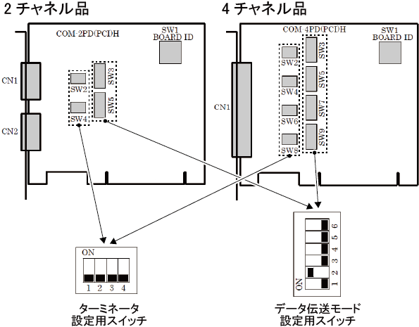 設定用スイッチチャネル SW2 SW3 CH1(CN1)用 SW4 SW5 CH2(CN2)用 - 4チャネル品のスイッチ