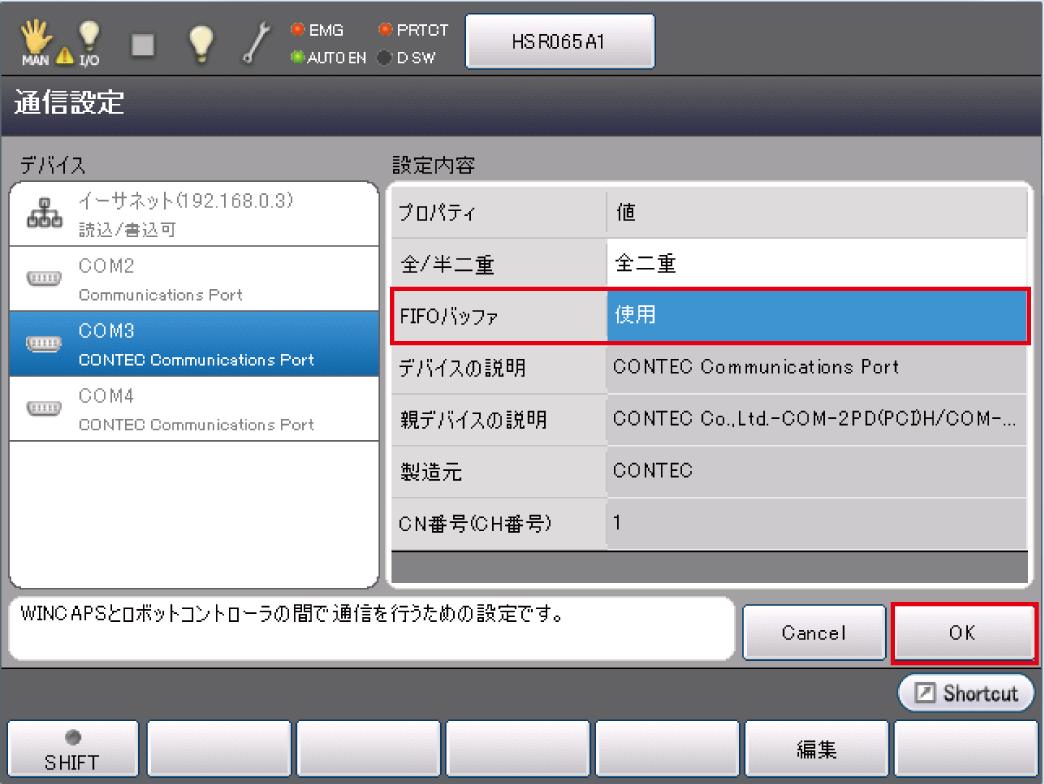 設定内容にあるFIFOバッファを選択し「編集」ボタンを押します。
