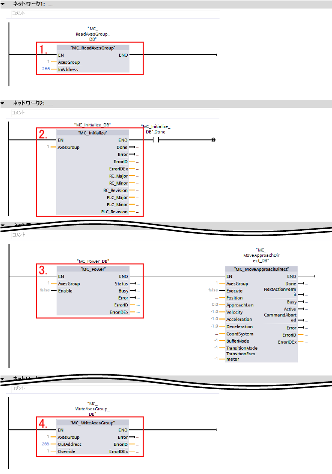 したがって、"MC_ReadAxesGroup"以外のFBを配置する前に、このFBを配置してください。