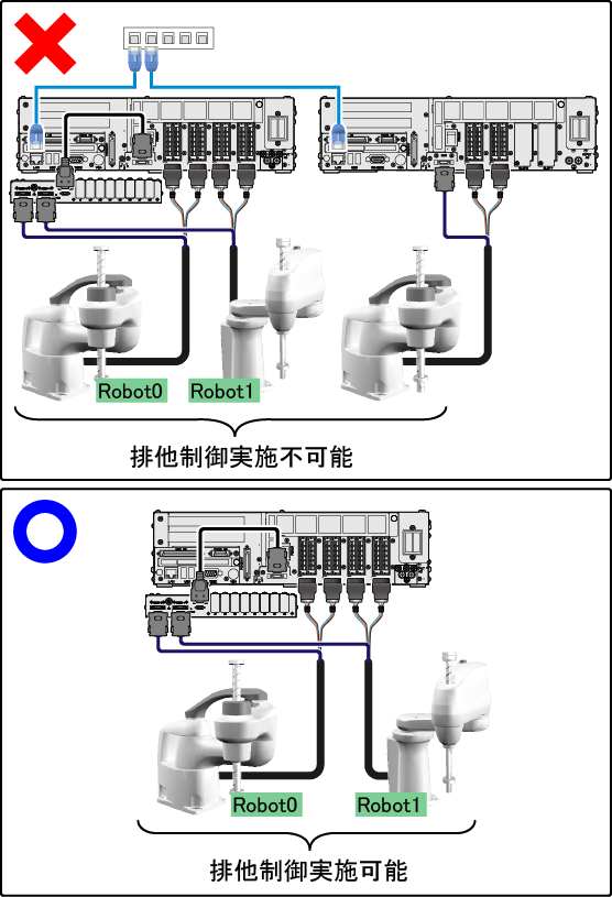 しかし、デュアルアーム制御機能を使用する場合、上記機能は、1台のRC8シリーズロボットコントローラまたはMC8シリーズモーションコントローラの中でのみ機能します。 下図は排他制御を実施する場合の例です。