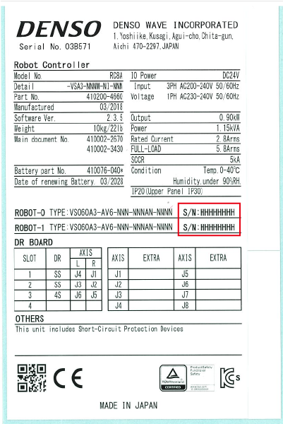ロボットコントローラ上面にコントローラ設定表が貼付されています。下図の赤枠で示す位置に、Robot0とRobot1の製番が記載されています。