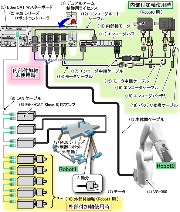 (下図は、RC8シリーズ用ロボットとしてVS-060、MC8シリーズ制御ロボットとして3軸ロボットを制御する例です。)
