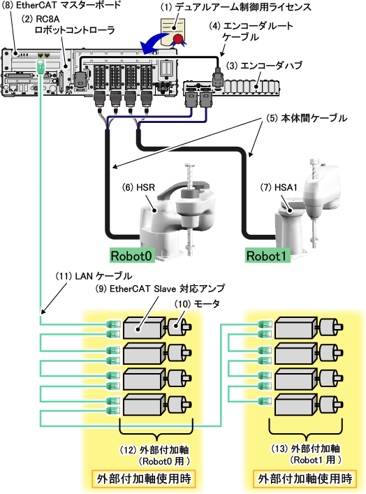 RC8シリーズ用ロボットの接続 外部軸の接続 "外部付加軸(EtherCAT)取扱説明書"の"ハードウェア接続構成" -