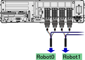 付加軸を使用する場合、上図のように接続することで使用可能です。 使用可能な軸数は、ロボット1台に付き、0軸~4軸です。 Robot0とRobot1のどちら用の軸になるのかは、EtherCAT Slave 対応アンプの接続順に関係しています。 EtherCAT マスターボードに最初に接続されたEtherCAT Slave 対応アンプから順に、Robot0の5軸、Robot0の6軸と割り当てられます。 より詳しい内容については、"外部軸の各ロボットへの割当て"を参照してください。 |
