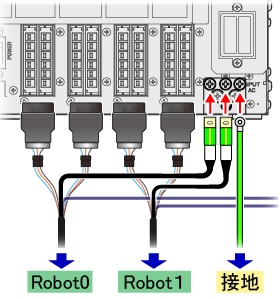 HSRおよびHSA1の2台のロボットを制御するコントローラです。 ロボット用の接地端子が3個ついています。下図のように接続してください。