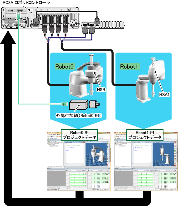 デュアルアーム制御機能では、RC8シリーズロボットコントローラ(以降 RC8シリーズ)またはMC8シリーズモーションコントローラ(以降 MC8シリーズ)は、2つ分のプロジェクトデータを管理しています。