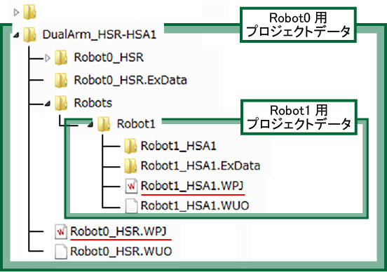 WINCAPSIIIでRobot0のプロジェクトデータを編集する場合は、上図の場合、"Robot0_HSR.WPJ"(プロジェクトファイル)を開くことで行えます。Robot1の場合は、"Robot1_HSA1.WPJ"を開きます。