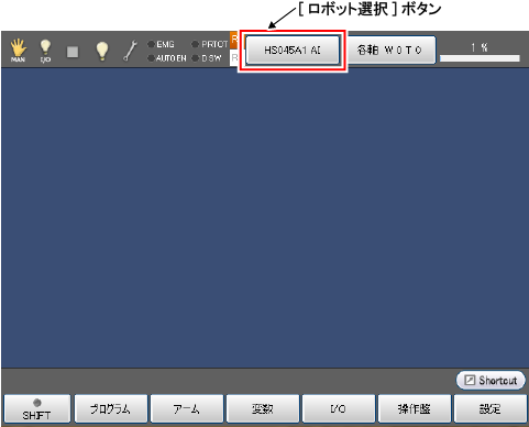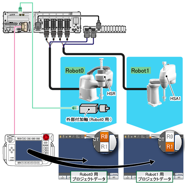 ティーチングペンダントでは、2つのプロジェクトを"ロボット選択"によって切り替えます。