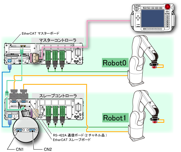上図では、Robot0の力センサは、Robot1のロボットコントローラに実装されているRS-422A通信ボード(2チャネル品)の、CN1(以降、Robot1:RS-422A_CN1)に接続されています。