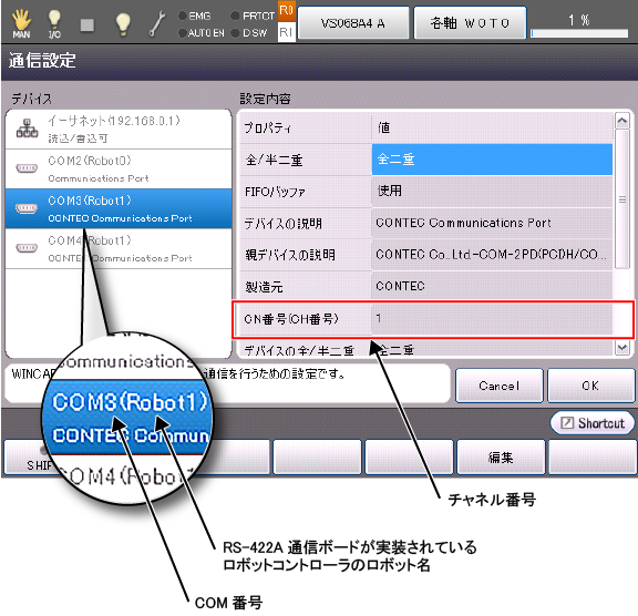 Robot0の力センサはRobot1:RS-422A_CN1に接続されているので、上のウィンドウから、COMの番号は"3"であることがわかります。