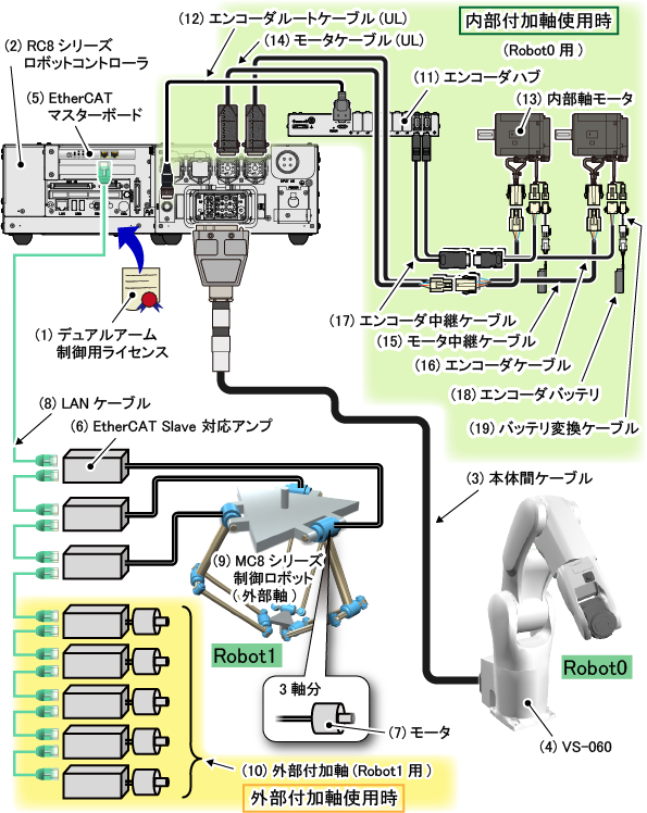 (下図は、RC8シリーズ用ロボットとしてVS-060、MC8シリーズ制御ロボットとして3軸ロボットを制御する例です。)