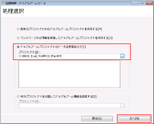 "デュアルアームプロジェクトのデータ送受信を行う"を選択し、"プロジェクト"欄に、送受信するデュアルアーム制御用プロジェクトのプロジェクトファイルを入力します。プロジェクトファイルは、その格納場所を絶対パスで入力してください。