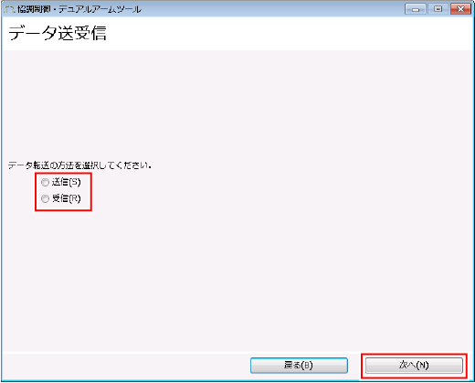 "送信"か"受信"を選択し[次へ]をクリックすると、選択した処理が実行されます。