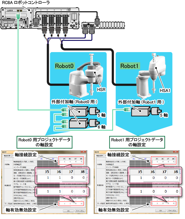 Robot0とRobot1のどちらに対する外部軸になるのかは、EtherCAT Slave 対応アンプの接続順に関係しています。
