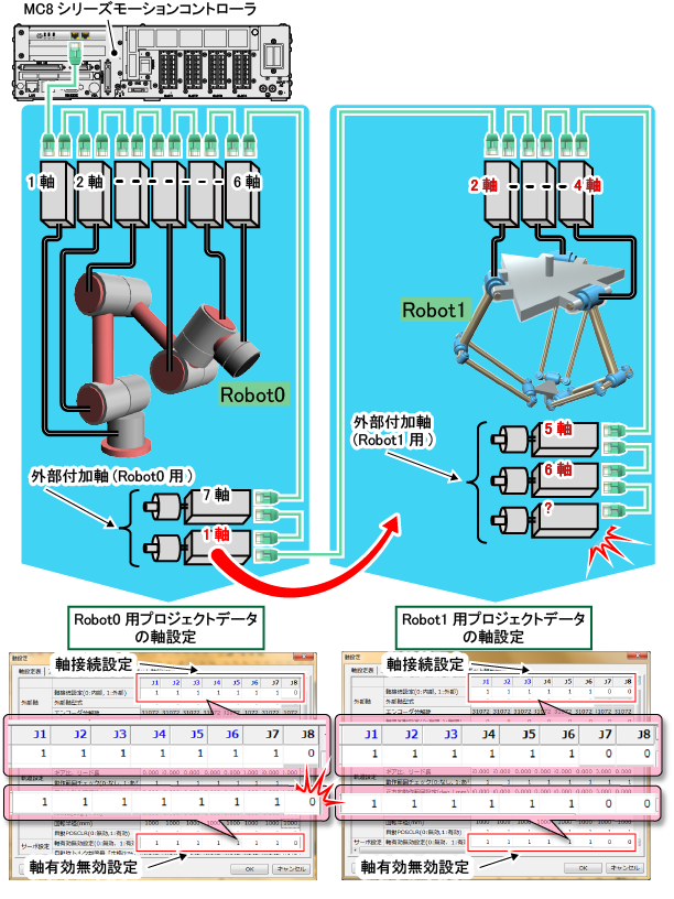 しかし、Robot0用プロジェクトデータの軸設定で、7軸までしか使用しない設定にしてしまったとします。その場合、本来Robot0の8軸としたかった軸が、Robot1の1軸として割当てられてしまい、希望通りの動作をさせることができなくなってしまいます。