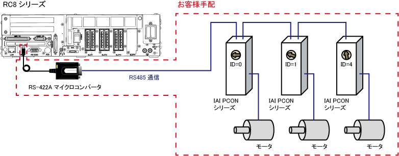 RC8とIAI PCON (以下PCON) はRS485通信で接続します。