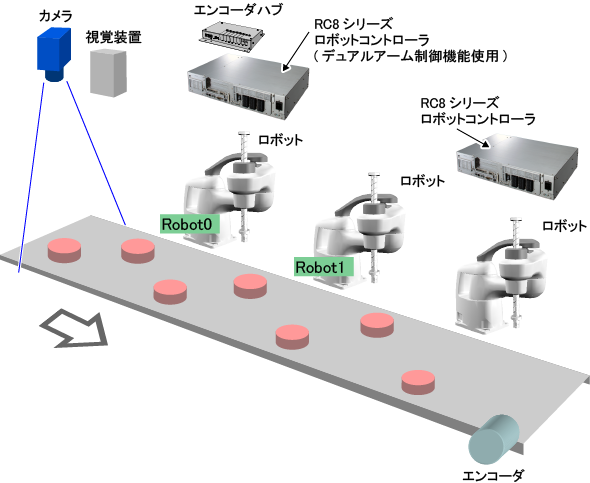 - ロボット4台でコンベア1台のワークをピックアップする場合、デュアルアーム制御機能を適用できるロボットコントローラは1台だけです。2つのロボットコントローラにデュアルアーム制御機能を適用し、計4台のロボットでコンベアトラッキングを行うことはできません。