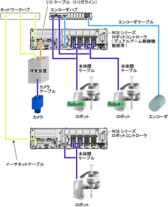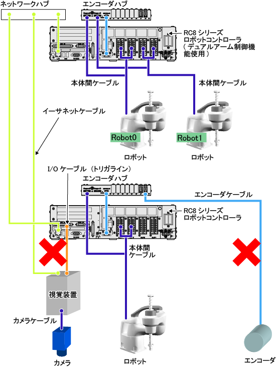 コンベアのエンコーダと視覚装置のトリガラインは、必ずデュアルアームコントローラに接続してください。通常コントローラに接続すると、正しく動作しません(下図を参照)。