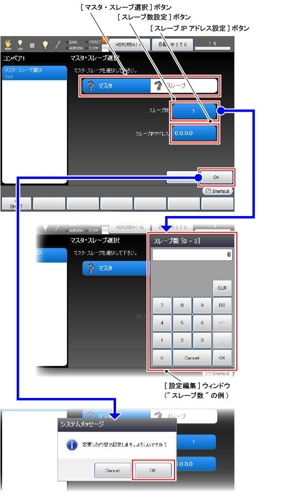 設定方法 : [スレーブ数設定]ボタンを押し、[設定編集]ウィンドウから"1"を選択後、[設定編集]ウィンドウの[OK]ボタンを押す。 |