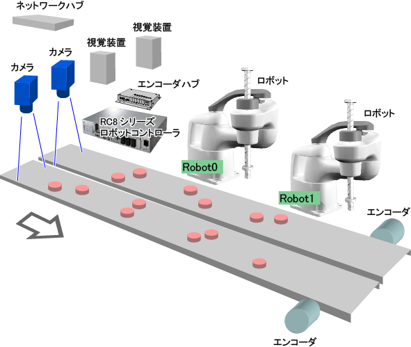 2台のコンベアに流れてくるワークを、2台のロボットでピックアップする場合などには、コンベア2台を、ロボット2台で共有します。