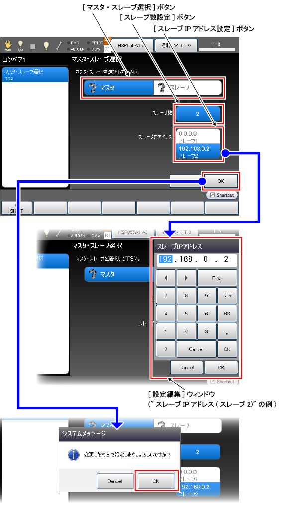 設定方法 : [スレーブIPアドレス設定]ボタンの中のスレーブ1またはスレーブ2を押し、[設定編集]ウィンドウでIPアドレスを入力後、[設定編集]ウィンドウの[OK]ボタンを押す。 |