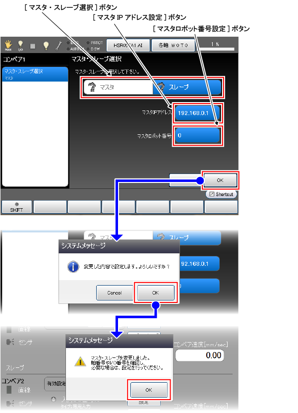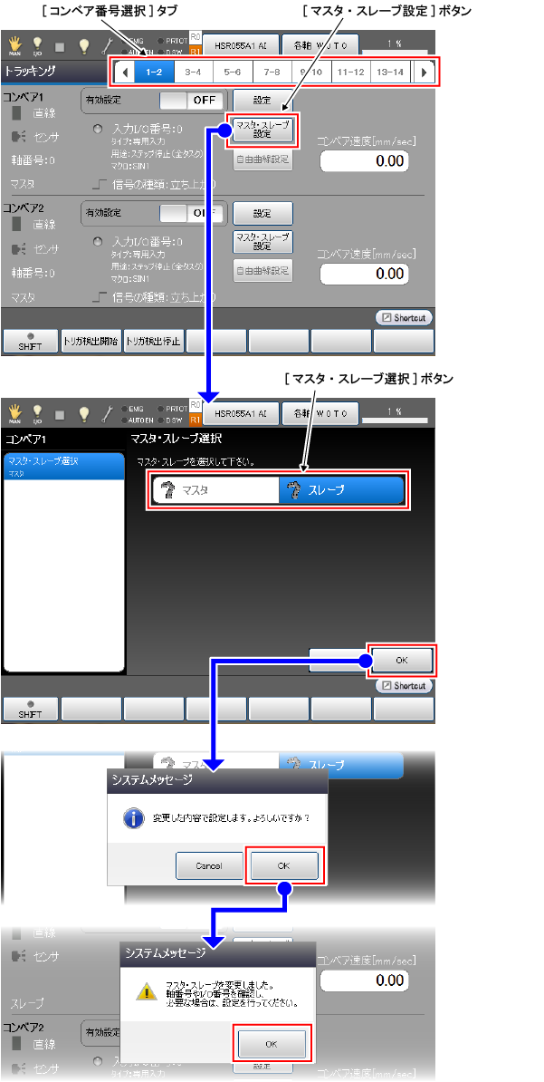 スレーブに設定されていたコンベアに対して、マスタに変更した場合、[マスタ·スレーブ選択]ウィンドウの[OK]ボタンを押すと、システムメッセージが2回でます。2回とも[OK]ボタンを押すと、[トラッキング]ウィンドウに戻ります。