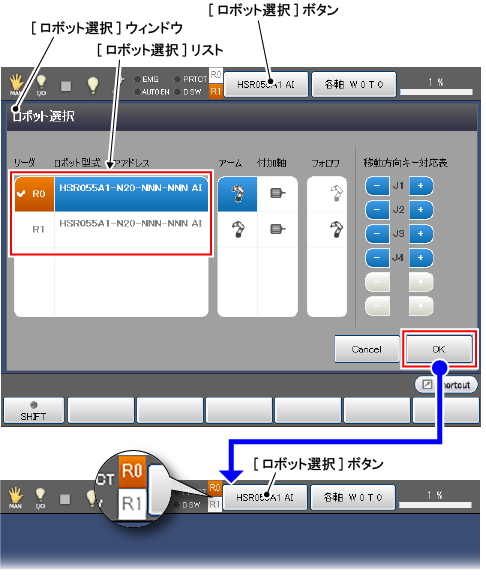 [ロボット選択]ボタンを押すと、[ロボット選択]ウィンドウが表示されます。[ロボット選択]リストから、Robot0(R0)を選択し、[OK]ボタンを押します。