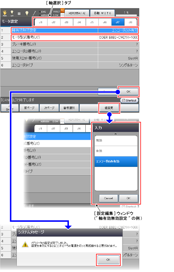 各パラメータを設定後、[モータ設定]ウィンドウの[OK]ボタンを押します。パラメータ設定完了のシステムメッセージが表示されますので、[OK]ボタンを押します。
