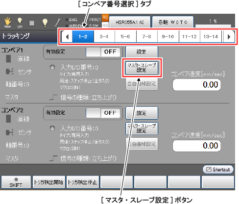 [コンベア番号選択]タブから、コンベア番号1と2のタブ("1-2")を選択し、コンベア番号1の[マスタ·スレーブ設定]ボタンを押します。