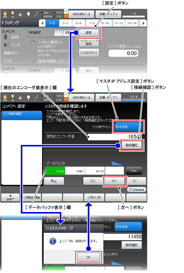 [接続確認]ボタンを押し、エンコーダが接続されていることを示すシステムメッセージが表示されることを確認します。システムメッセージの[OK]ボタンを押すと、[マスタとの接続確認]ウィンドウに戻ります。 |