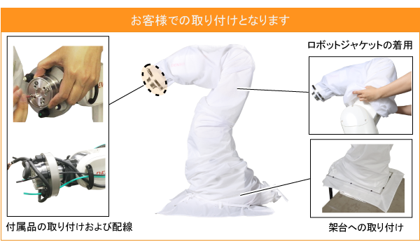 ロボットへの食品用ロボットジャケットセットの装着は、お客様ご自身で行っていただきます。本取扱説明書に装着方法を記載していますので、そちらを参照して装着してください。