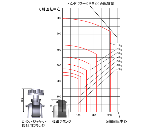 また、ハンドおよびワークなどのフランジにかかる負荷の質量を計算する際は、ロボット取付用フランジの質量 (0.7kg) も足してください。