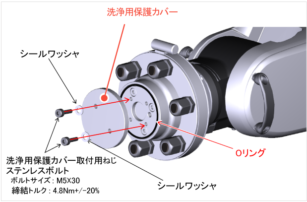 また、洗浄用保護カバーを取り付ける際には、ロボットジャケット取付用フランジAに必ずOリングが取り付いていることをご確認ください。