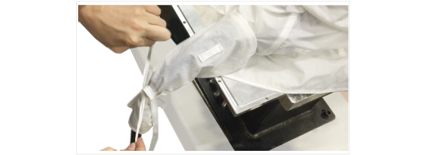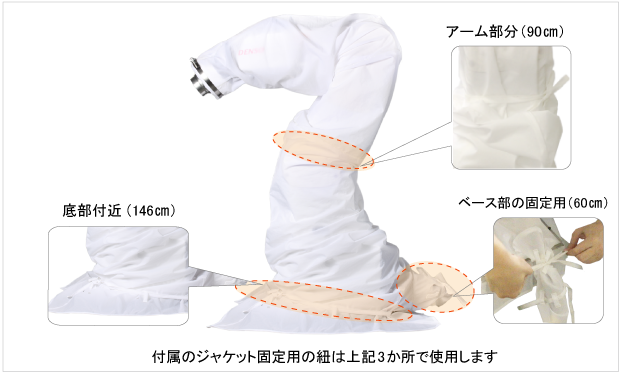 ロボットの底部の固定用の紐(146cm)をジャケット生地についているループ(4か所)に通してジャケット生地を固定させます。縛りが緩いとジャケット底部が動いてしまうので、きつめに縛ることを推奨します。