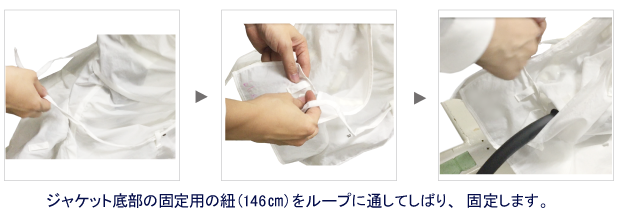 ジャケット底部をジャケット生地についているループを利用し、固定用の紐(146cm)で縛り、ジャケットを固定する手順を以下に記載します。