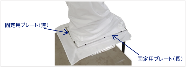 ジャケットの生地と底上げプレートを固定用プレートで挟み、ジャケットを固定させる手順を以下に記載します。